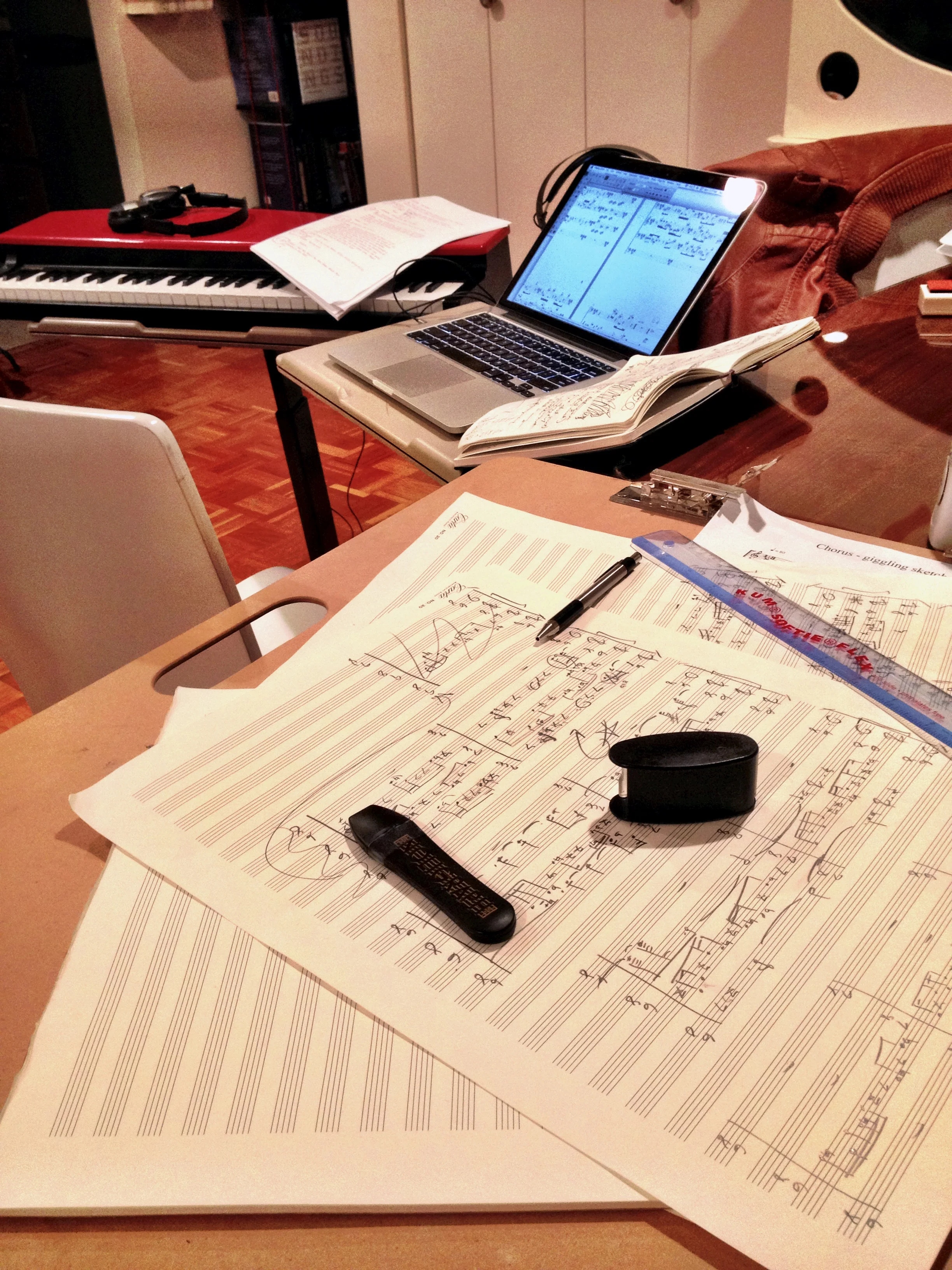 Just wrapped up a very productive weekend working on The Tower, my new collaborative piece with playwright Kevin Kordis and actor/director/my lovely wife Micah Greene. The project is unlike anything I've done before, so there's been lots to figure out (especially w/r/t notation, interpreting stage directions musically, incorporating long blocks of monologues into the music, etc.). It's shaping up to be a fun one to work on.